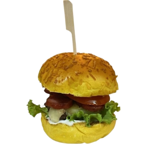 Pão Brioche, hambúrguer bovino 160g, queijo, Calabresa picante, Alface, Tomate e Maionese defumada da casa.