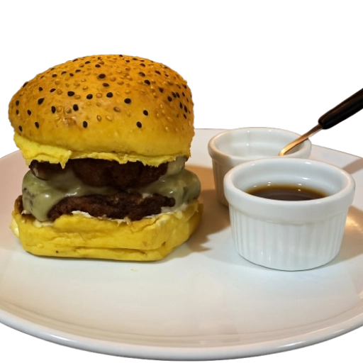 Pão Brioche, 2 hambúrguer bovino 160g, 2 queijos e Maionese defumada da casa.