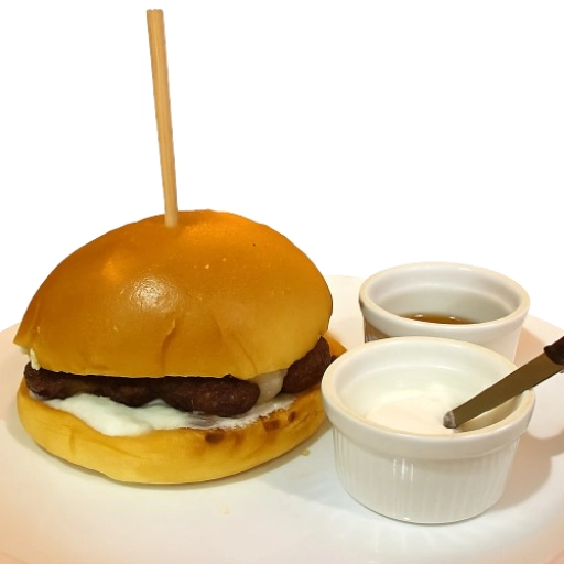 Pão Brioche, hambúrguer bovino 160g, queijo e Maionese defumada da casa.